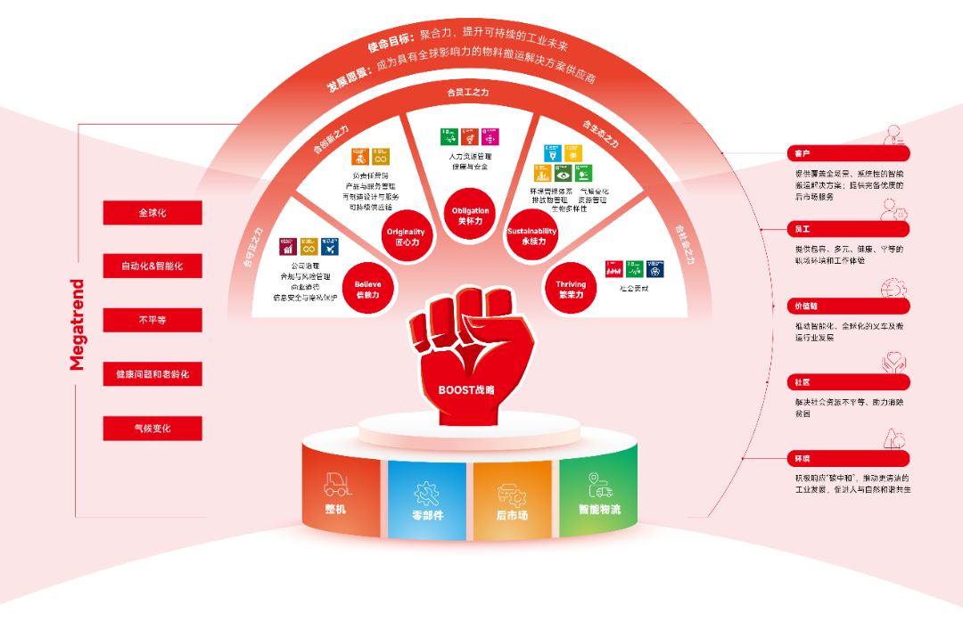 作為中國工業(yè)車輛行業(yè)的領(lǐng)軍企業(yè),安徽合力秉持“合力提升未來”的使命,系統(tǒng)構(gòu)建具有行業(yè)特色的ESG戰(zhàn)略管理與實(shí)踐體系,扎實(shí)推進(jìn)可持續(xù)發(fā)展“BOOST”戰(zhàn)略,全面深化ESG管理,持續(xù)提升ESG表現(xiàn),共繪可持續(xù)發(fā)展的工業(yè)藍(lán)圖,努力為實(shí)現(xiàn)經(jīng)濟(jì)繁榮、環(huán)境可持續(xù)和社會(huì)公平積極貢獻(xiàn)合力力量。